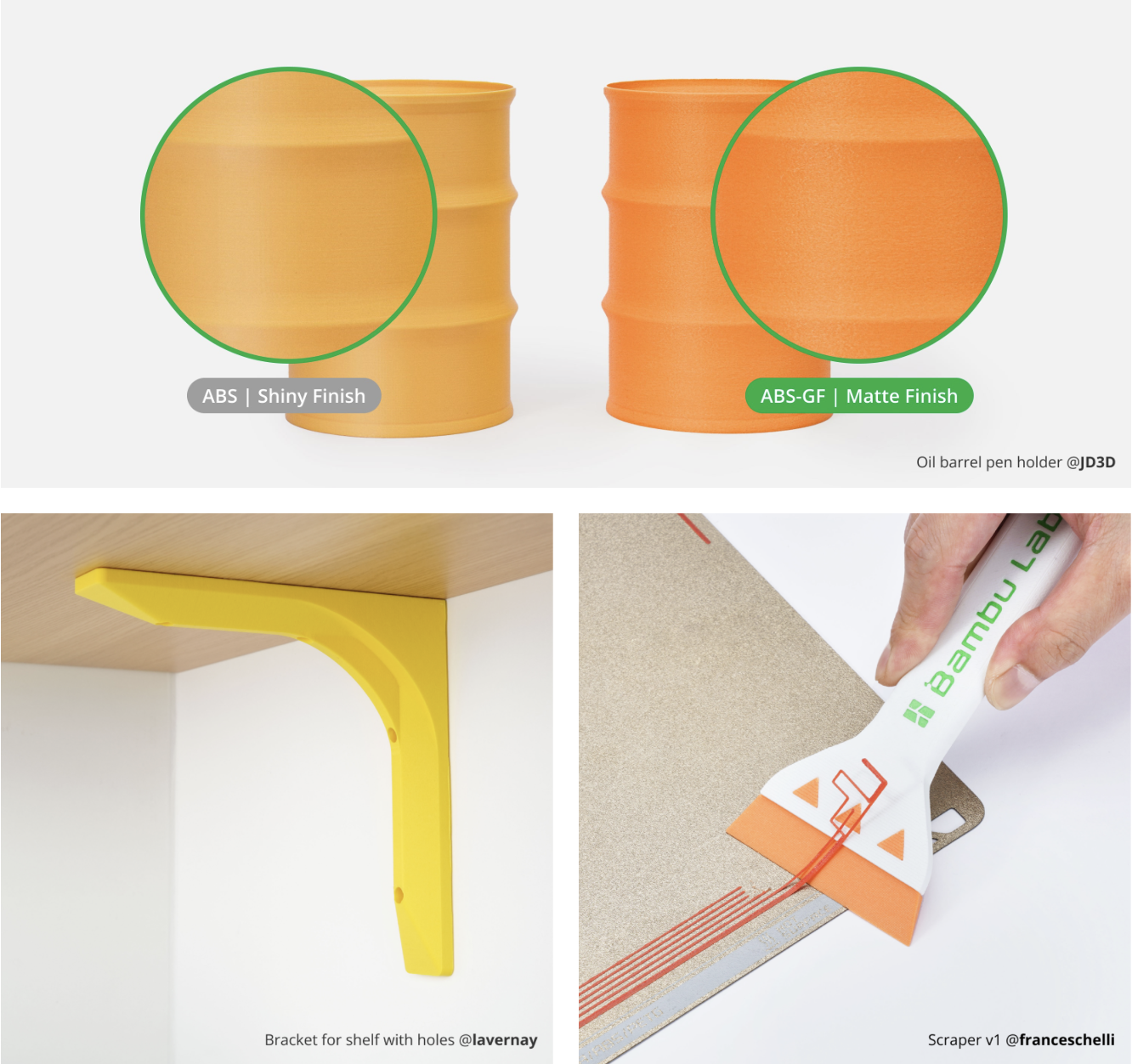 С улучшенной водостойкостью и прочностью Bambu ABS-GF идеально подходит для печати долговечных предметов для производства и бытового использования, таких как механические корпуса, соединители и формы.