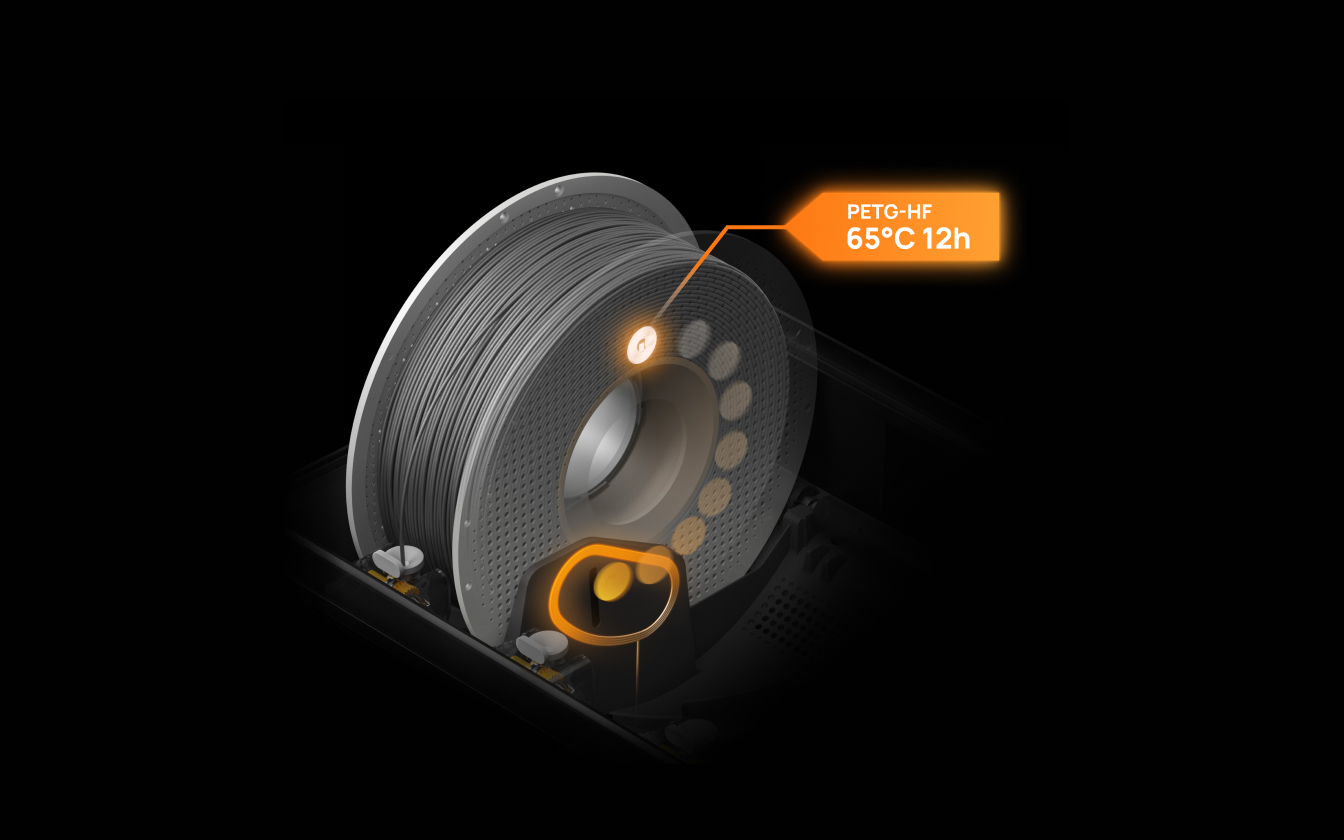 Во время сушки катушки филамента автоматически вращаются, обеспечивая более равномерное высушивание материала.
