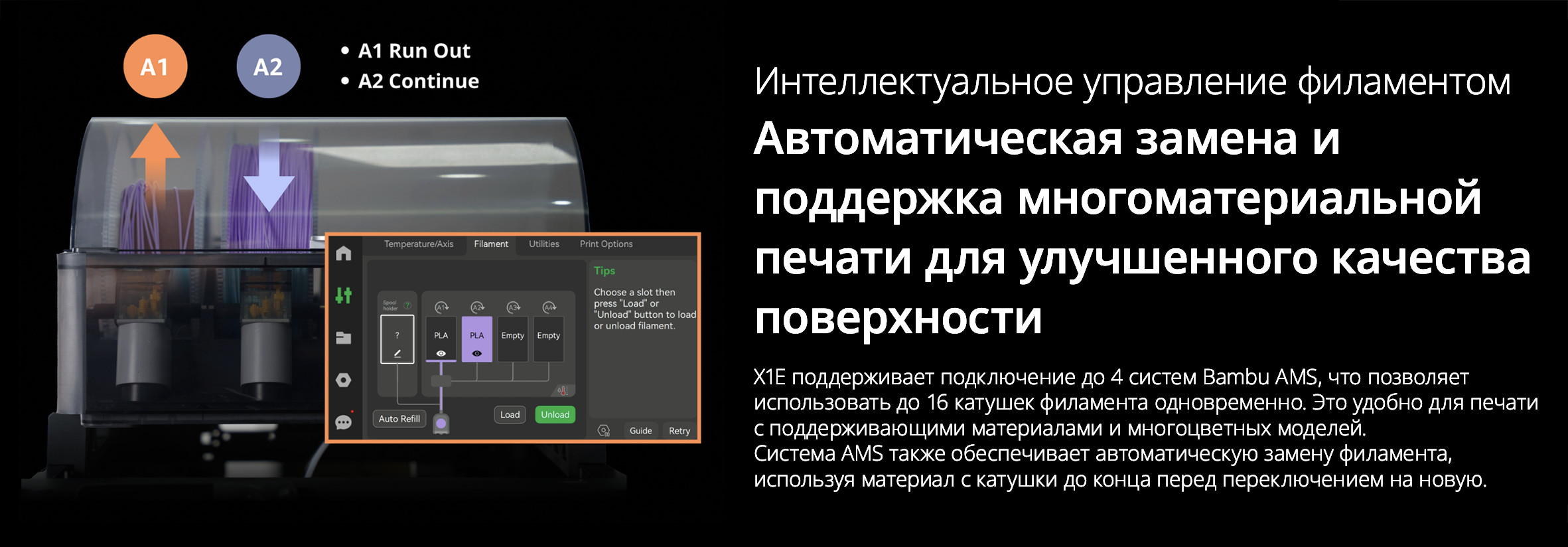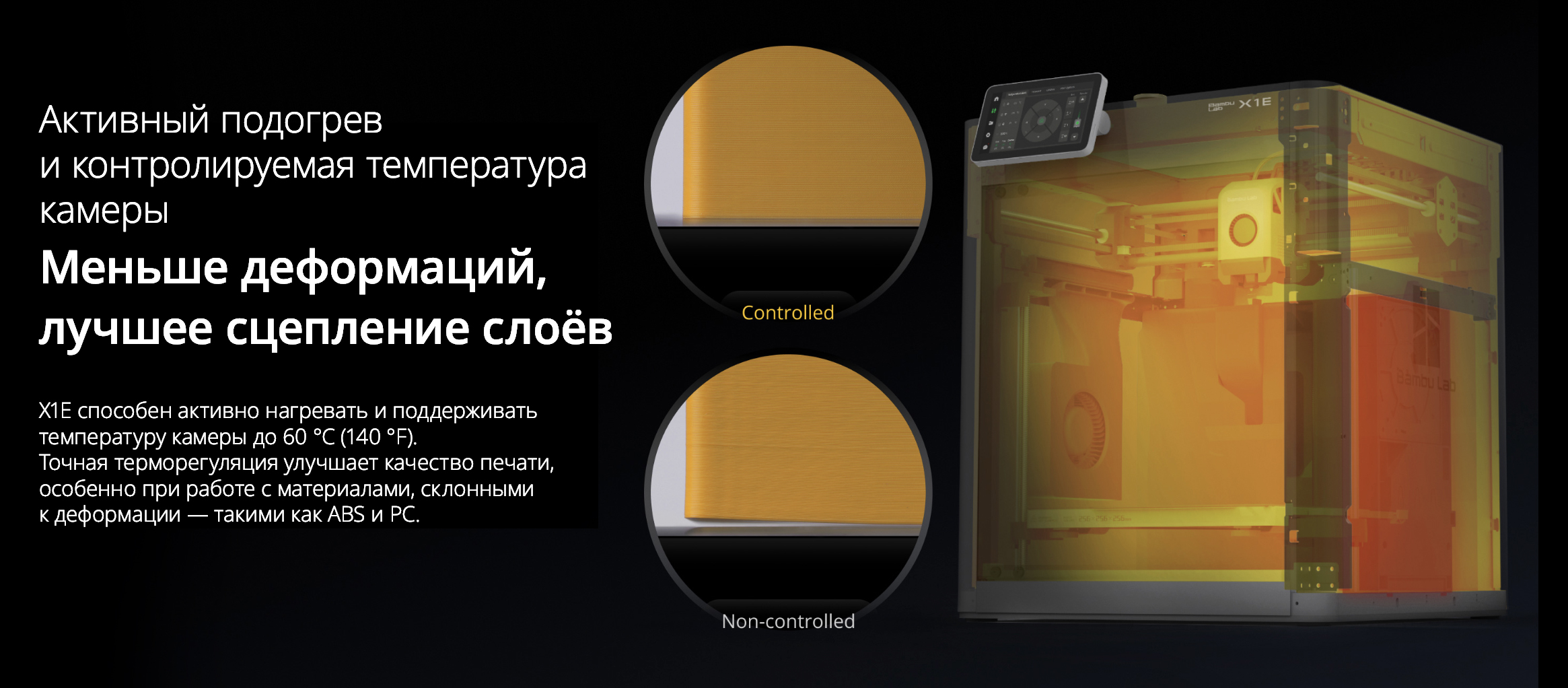 X1Е оснащен мощным хотэндом с максимальной температурой 320°C, позволяющим работать с более широким ассортиментом полимеров и композиционных материалов, включая PLA, ABS, ASA, PETG, полиамиды и поликарбонаты, более тугоплавкие полифенилсульфоны и полифталамиды, а также композиты на их основе с волоконными армирующими наполнителями.