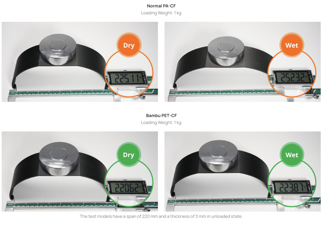 Даже при длительном воздействии влаги прочность и жёсткость PET-CF снижаются минимально, поэтому материал подходит для эксплуатации во влажных условиях.