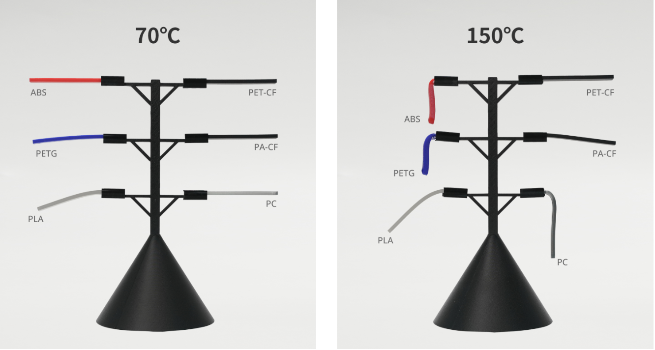 что делает PET-CF пригодным для деталей, работающих при повышенных температурах. Для сравнения, PLA начинает деформироваться только после достижения точки плавления около 155 °C, в то время как PET-CF сохраняет форму и прочность в этом диапазоне.