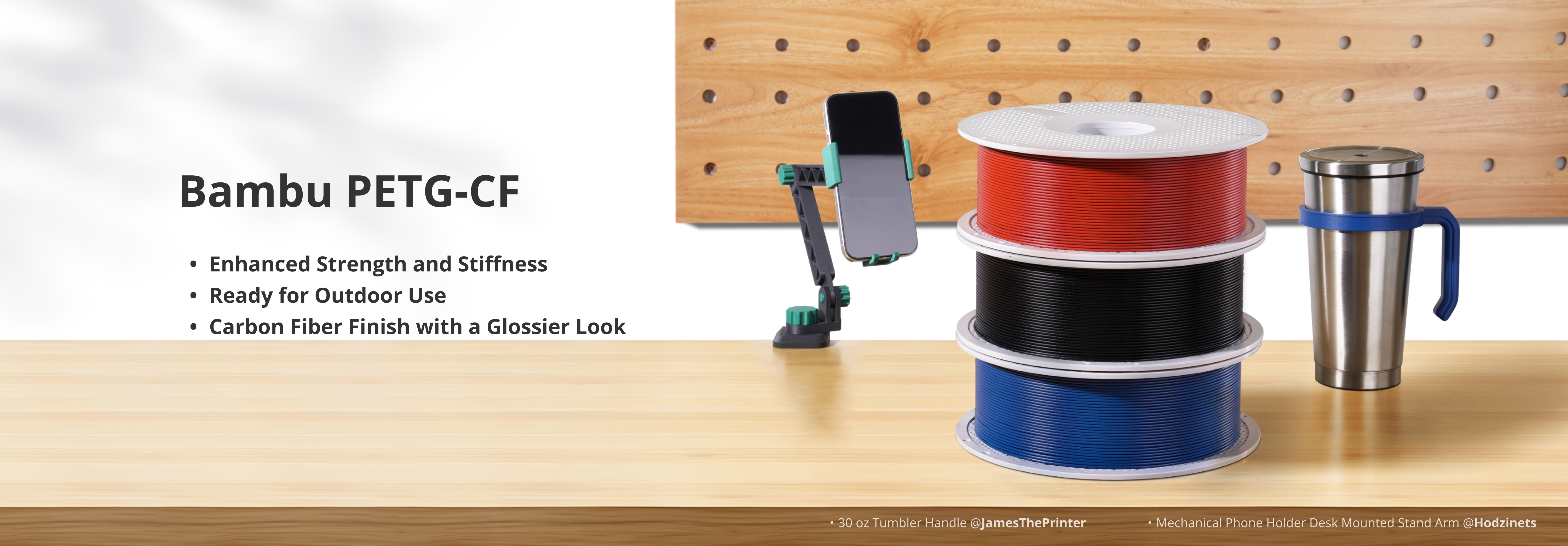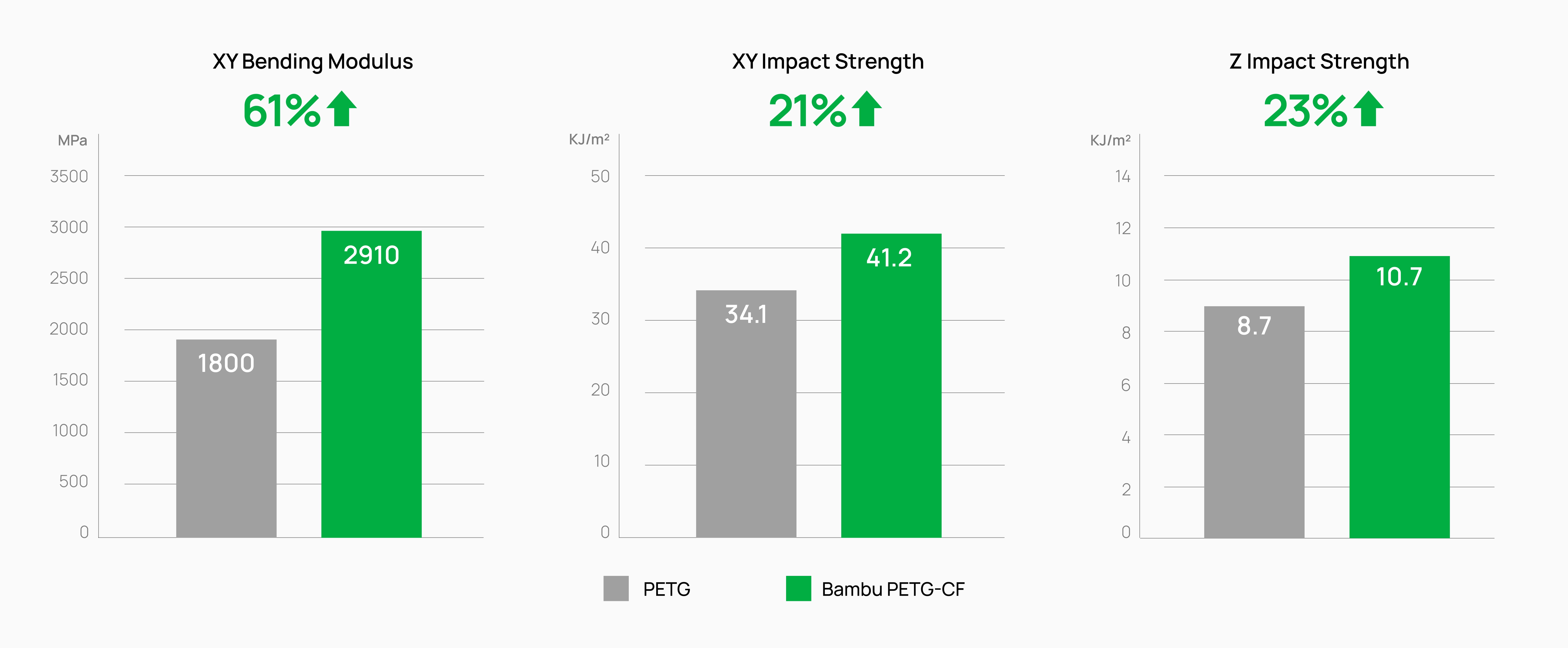 Благодаря добавлению углеродного волокна, Bambu PETG-CF преодолевает низкую жесткость обычного PETG и обеспечивает улучшенную прочность и ударную вязкость, что делает его надежным выбором для конструктивных и несущих деталей.