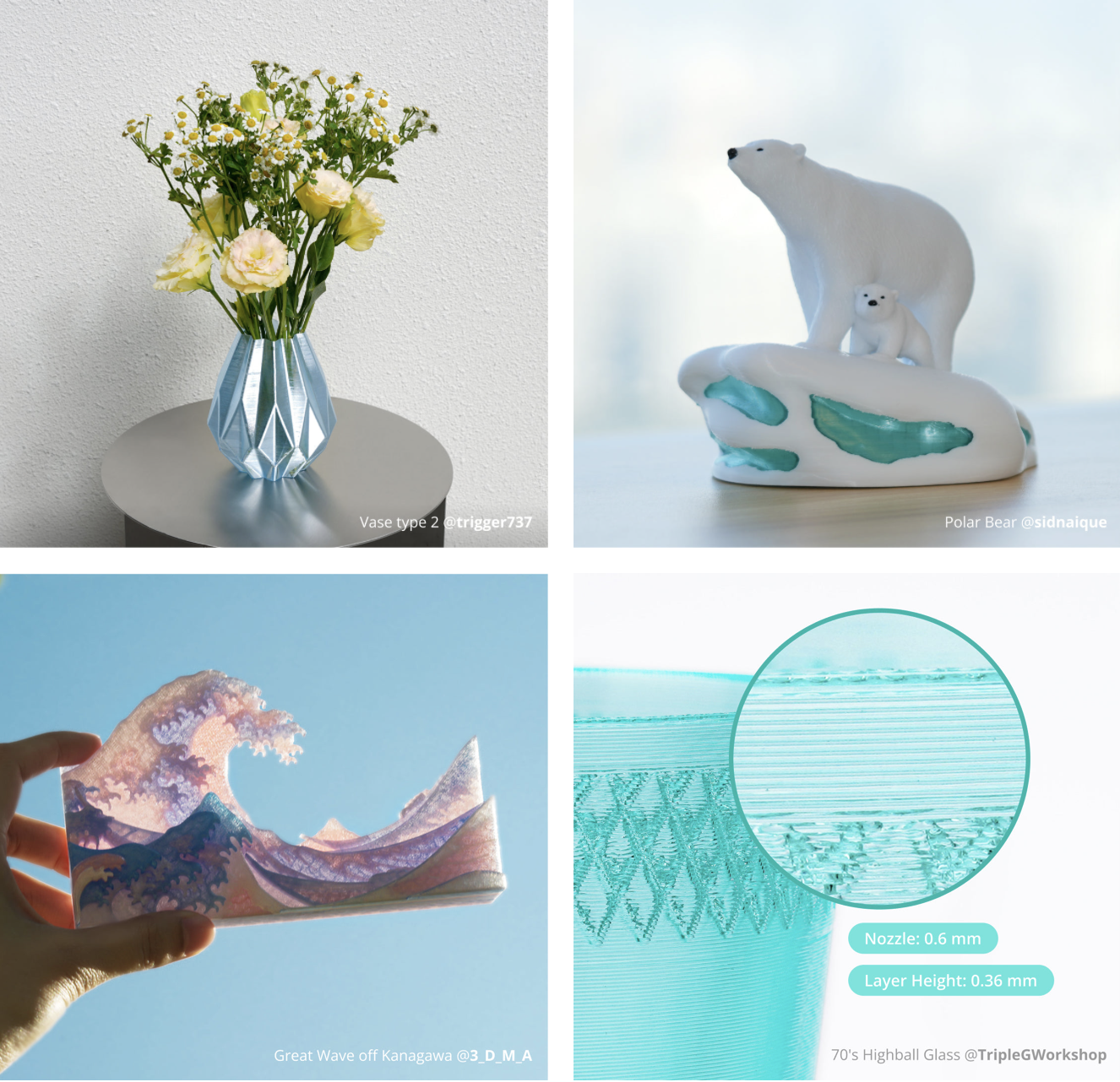 Печать PETG Translucent с соответствующими параметрами позволяет добиться вида от слегка прозрачного до почти полностью прозрачного. Подробнее о советах по печати прозрачного PETG см. на WIKI.