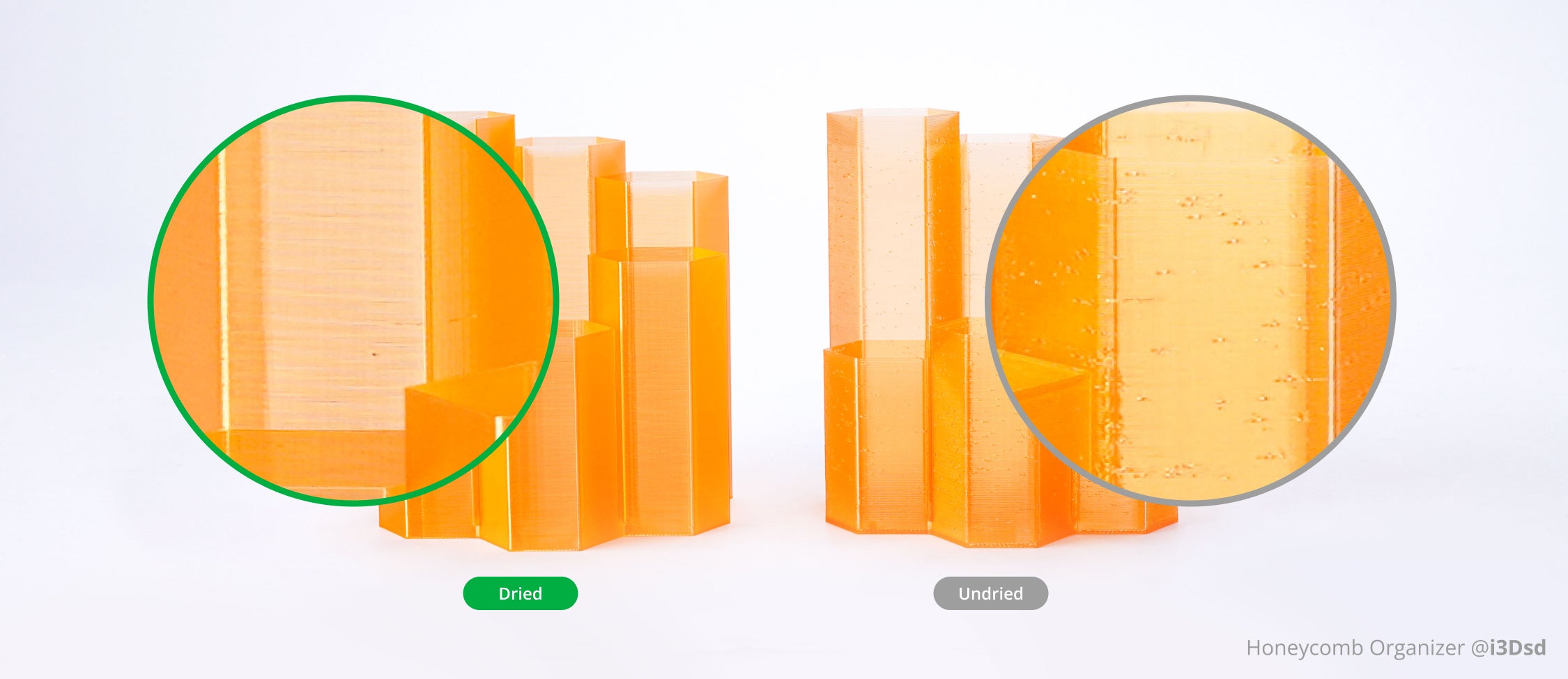PETG Translucent необходимо высушить перед использованием, а также обеспечить защиту от влаги во время печати, иначе качество изделий будет снижено из-за пузырей. Рекомендуемые условия сушки: 65 ℃ в течение 8 часов. Более подробную информацию см. в инструкции по сушке филамента на WIKI.