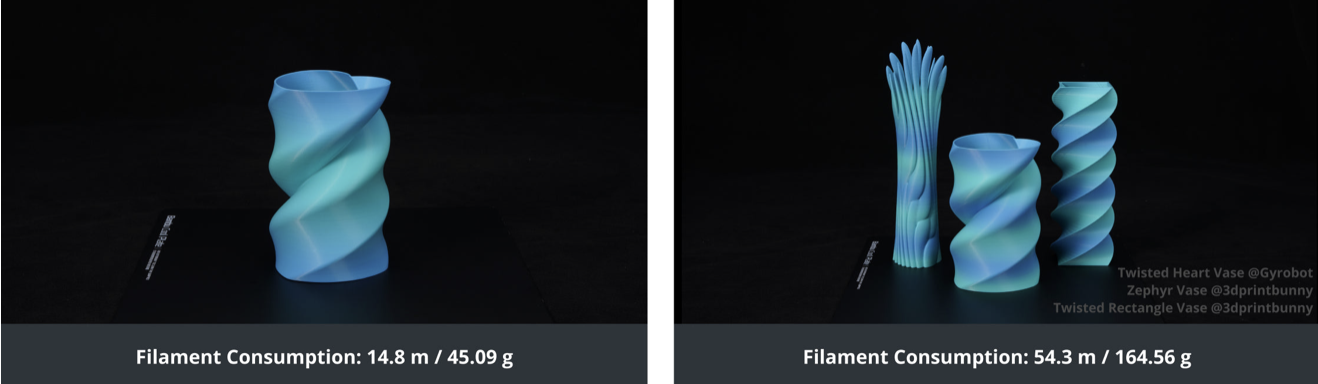 У мелких моделей с низким расходом филамента переход цветов будет менее заметен, а у крупных изделий с большим расходом — градиент проявляется плавно и эффектно.