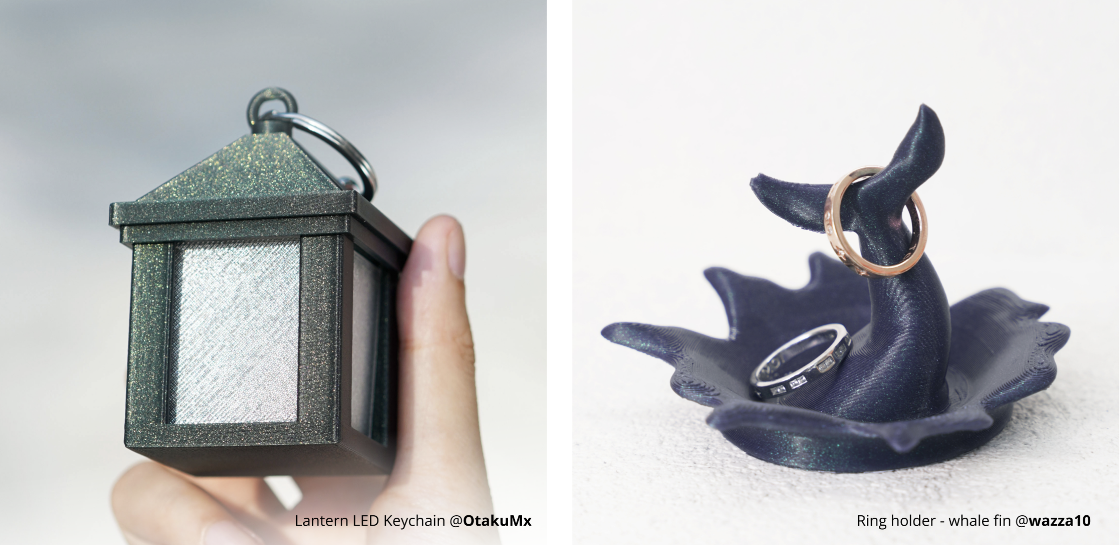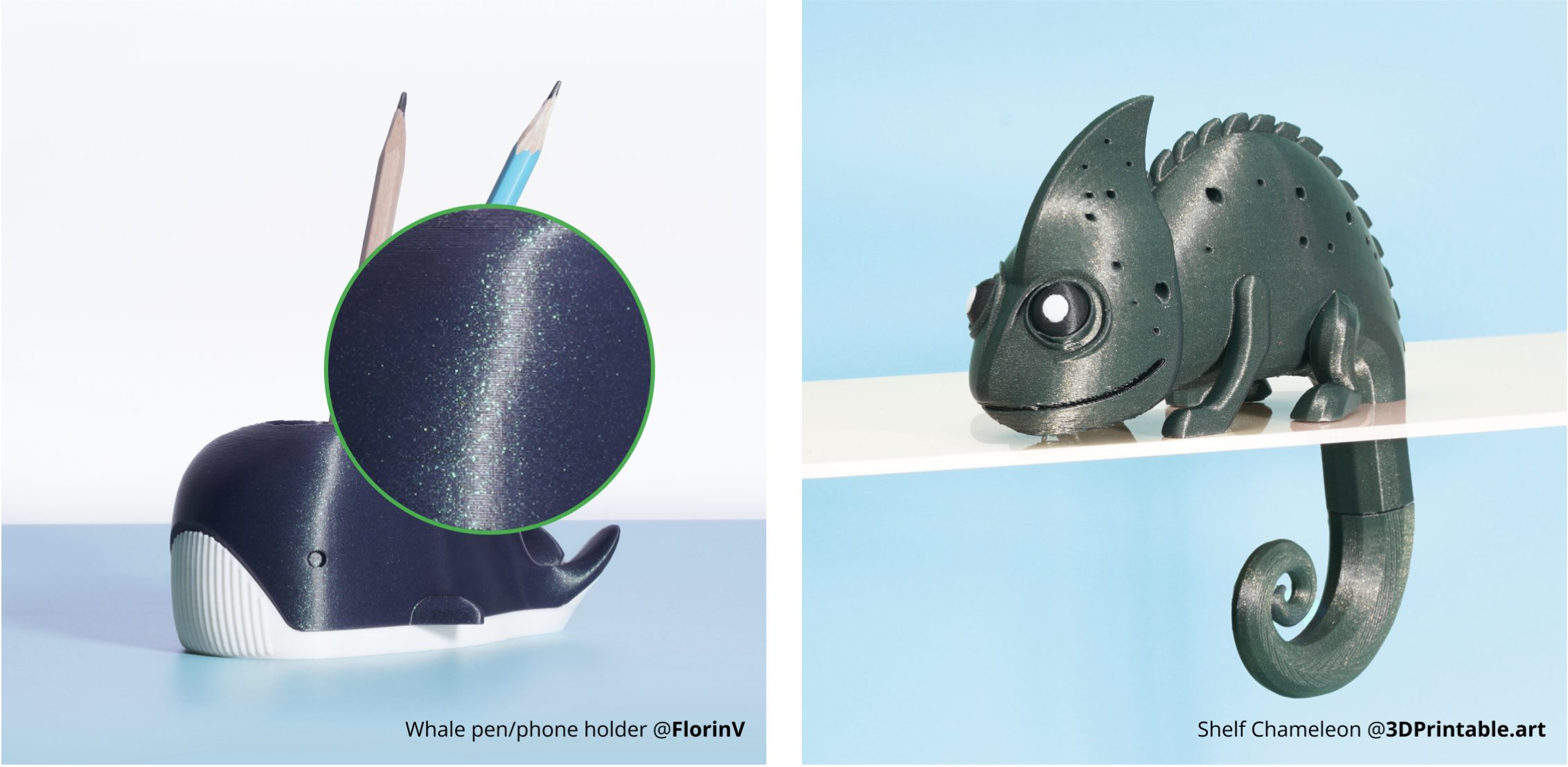 Благодаря добавлению стеклянных микросфер, филамент создаёт уникальные световые эффекты, которые меняются при каждом повороте модели. Результат — изделия, притягивающие взгляд с любой стороны.