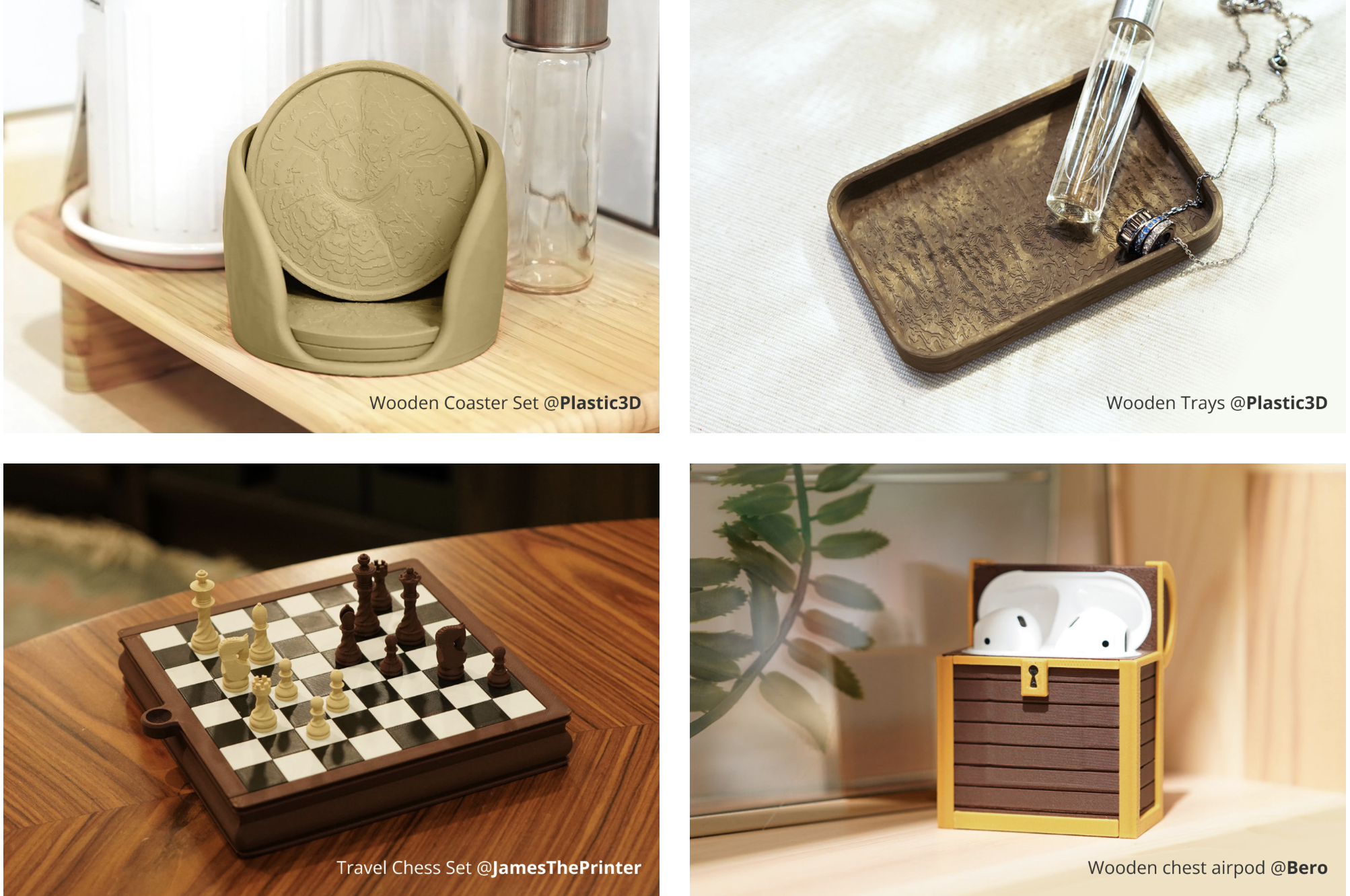 Bambu PLA Wood легко комбинируется с другими филаментами, такими как PLA Basic и PLA Matte, позволяя сочетать натуральные древесные текстуры с яркими цветами. Создавайте многослойные или комбинированные модели, добавляйте деревянные вставки и детали — и воплощайте свои творческие идеи в жизнь.