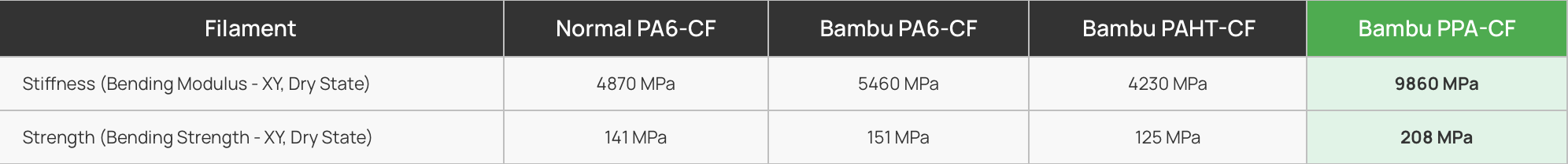 Bambu PPA-CF по прочности приближается к металлическим материалам — он на 48% прочнее и на 102% жёстче, чем обычный PA6-CF.