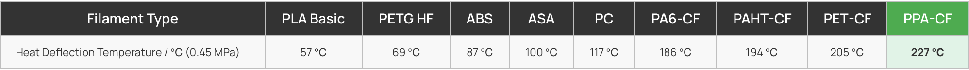 Bambu PPA-CF выдерживает длительное воздействие температур до 227 °C, не теряя прочности и формы. Этот материал надёжен даже в экстремальных условиях, поэтому подходит для автомобильных, промышленных и механических компонентов, где требуется высокая термостойкость.
