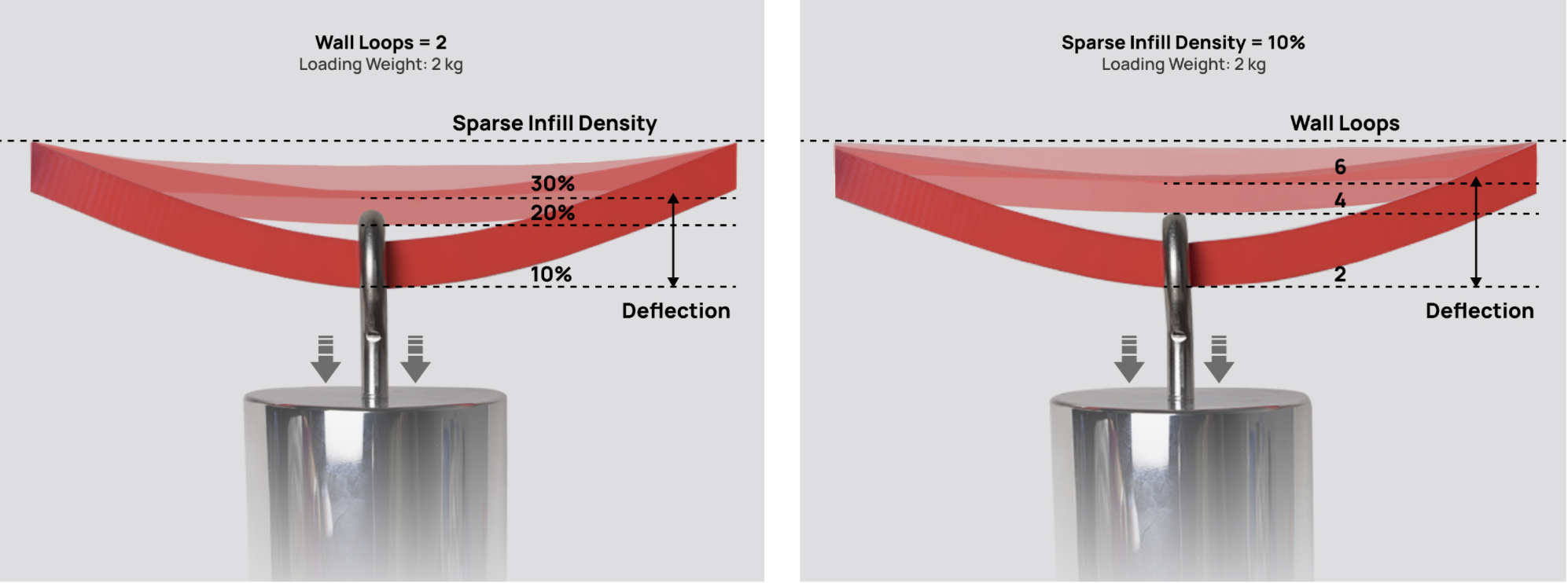 Эластичность TPU-заготовок зависит от настроек Wall Loops (число контуров стенок) и Sparse Infill Density(плотность неполного заполнения). Чем выше значения этих параметров, тем меньше эластичность, и наоборот.